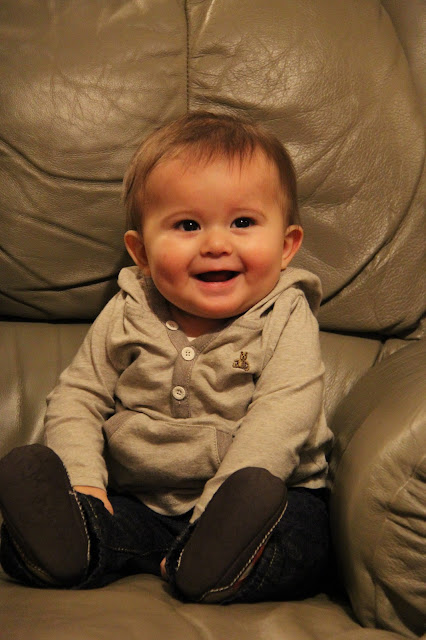 He found the stairs the other day. I heard him crying a bit and found him halfway down.....goodness.....so now the baby gate is up all the time, but with the way our stairs are, there is one step that can't be sectioned off.....and he goes for every chance he gets. He army crawls right over to it, puts his hand down, teeters on his tummy, face plants down it, cries and then looks at you like "Why didn't you tell me that was there?!?!?" We pick him up, cuddle him and put him down IN ANOTHER ROOM and he goes right back for more pain..... sigh. Oh well! He's cute and that's all that matters!